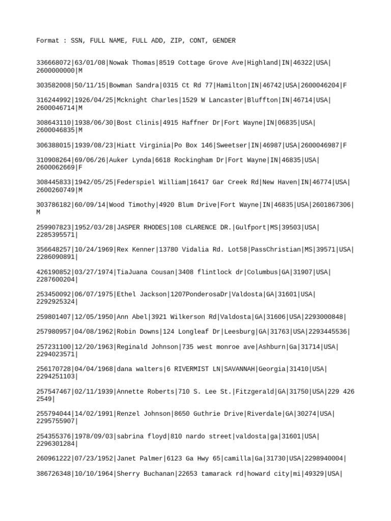 Format : SSN, FULL NAME, FULL ADD, ZIP, CONT, GENDER