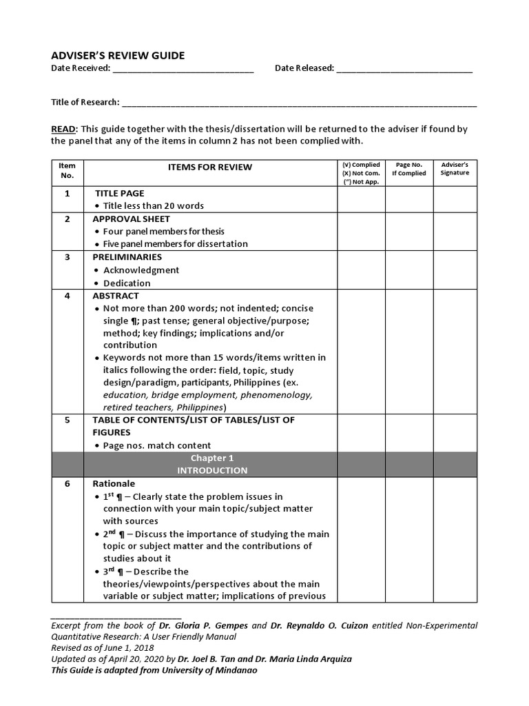 2. Another use of this guide is for the adviser to have a thorough evaluation of the paper before outline defense (Items 1-22, 30 and 33 except