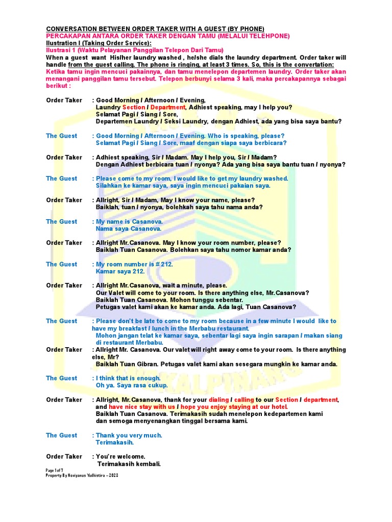 sebutkan identitas : kamu bisa mengucapkan VALET SERVICE / LAUNDRY SERVICE) dan selajutnya