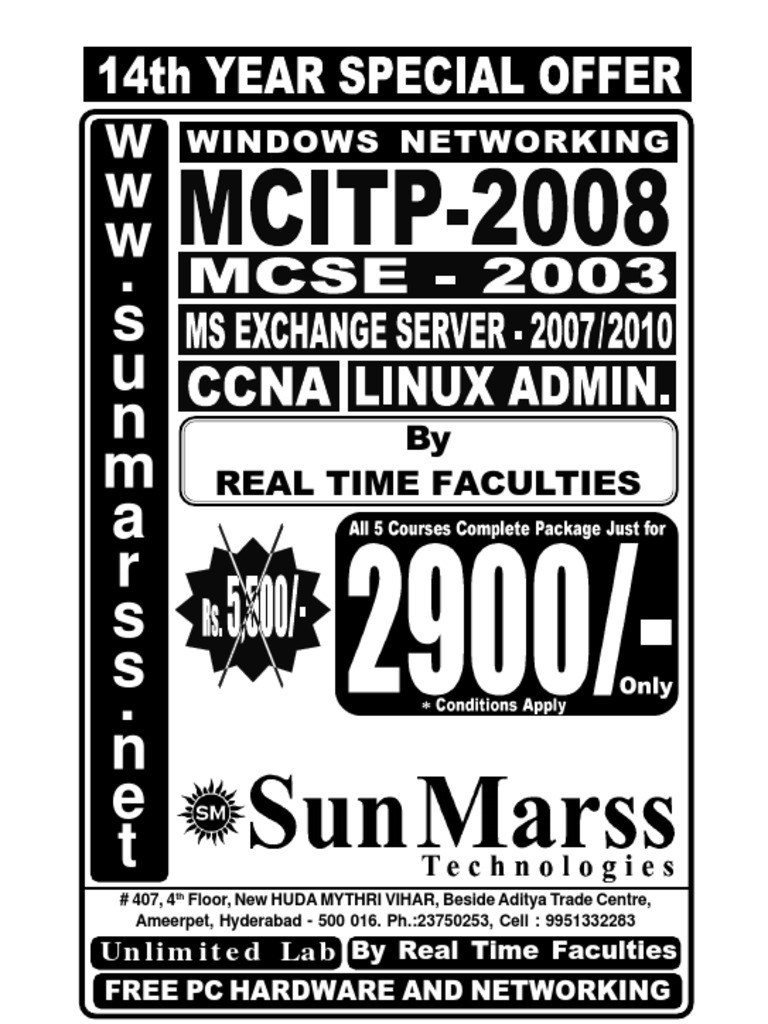 (ENTERPRISE ADMINISTRATOR & SERVER ADMINISTRATOR) Network & Operating System Essentials Installation of Windows 2008 Server Managing Microsoft Windows 2008 Network Environment Configuration and Designing of Microsoft Windows 2008 Active Directory Infrastructure, Network Infrastructure and Application Infrastructure Installing, Configuring & Implementing the following Microsoft Servers Windows 2008 Active Directory Server Windows 2008 DNS & DHCP Servers Live Configuration of Terminal Server Windows 2008 IIS Server Live Configuration of RODC Server Introduction to RAS and VPN Server Microsoft Exchange server 2007 & 2010 SPECIAL IMPORTANT PRACTICAL DEMOS Live Upgradation of Windows 2003 to 2008 Live setup of DC to ADC with FSMO Roles Live scenario of Domain Renaming Concept Live setup of System State Backup & Restoration Live configuration of NAT Server