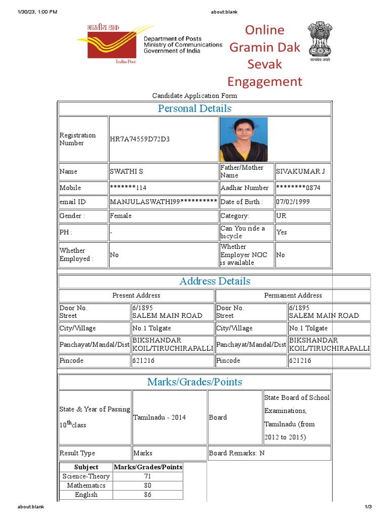 email ID MANJULASWATHI99********** Date of Birth : 07/02/1999