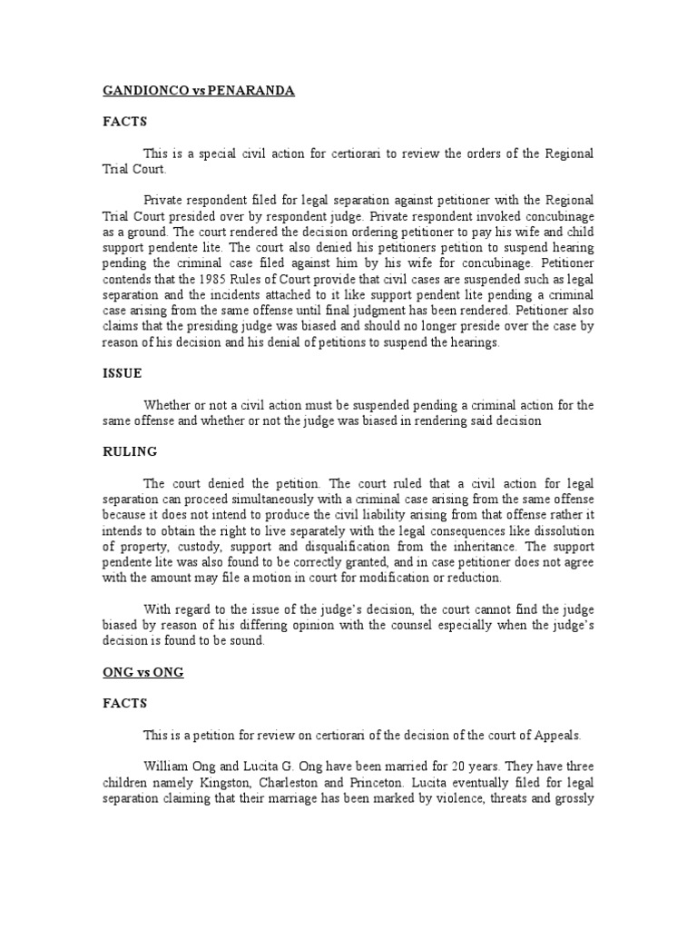 Court. Private respondent filed for legal separation against petitioner with the Regional Trial Court presided over by respondent judge. Private respondent invoked concubinage as a ground. The court rendered the decision ordering petitioner to pay his wife and child support pendente lite. The court also denied his petitioners petition to suspend hearing pending the criminal case filed against him by his wife for concubinage. Petitioner contends that the 1985 Rules of Court provide that civil cases are suspended such as legal separation and the incidents attached to it like support pendent lite pending a criminal case arising from the same offense until final judgment has been rendered. Petitioner also claims that the presiding judge was biased and should no longer preside over the case by reason of his decision and his denial of petitions to suspend the hearings. ISSUE Whether or not a civil action must be suspended pending a criminal action for the same offense and whether or not the judge was biased in rendering said decision RULING The court denied the petition. The court ruled that a civil action for legal separation can proceed simultaneously with a criminal case arising from the same offense because it does not intend to produce the civil liability arising from that offense rather it intends to obtain the right to live separately with the legal consequences like dissolution of property, custody, support and disqualification from the inheritance. The support pendente lite was also found to be correctly granted, and in case petitioner does not agree with the amount may file a motion in court for modification or reduction. With regard to the issue of the judges decision, the court cannot find the judge biased by reason of his differing opinion with the counsel especially when the judges decision is found to be sound. ONG vs ONG FACTS This is a petition for review on certiorari of the decision of the court of Appeals. William Ong and Lucita G. Ong have been married for 20 years. They have three children namely Kingston, Charleston and Princeton. Lucita eventually filed for legal separation claiming that their marriage has been marked by violence, threats and grossly