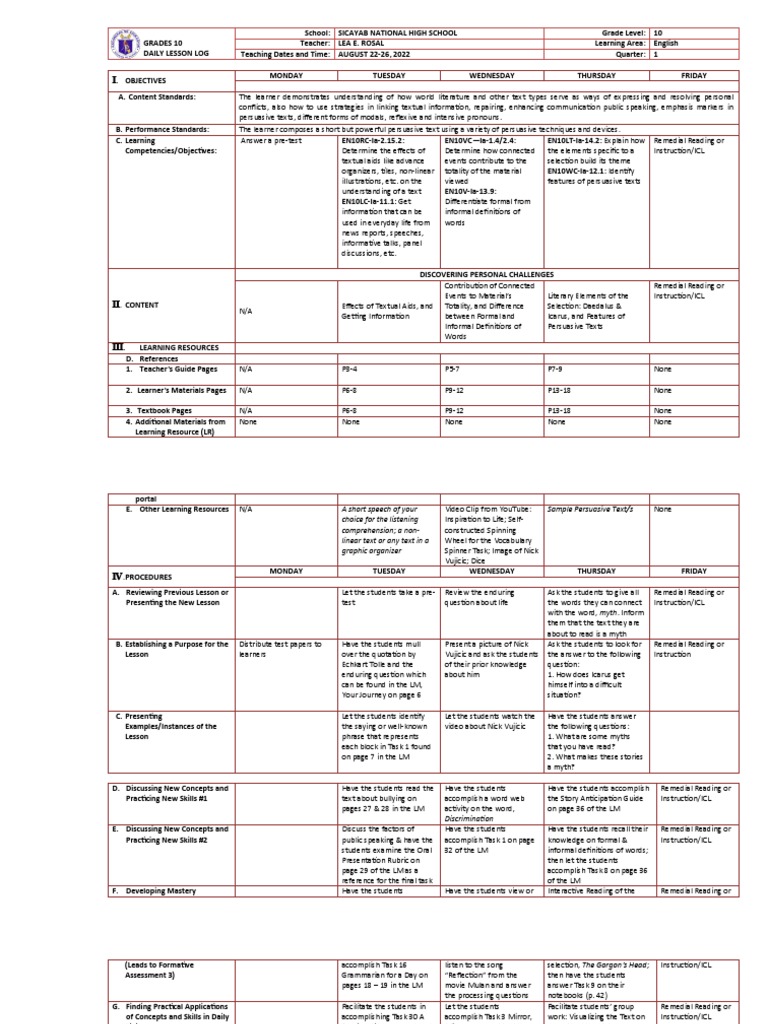 DAILY LESSON LOG Teaching Dates and Time: AUGUST 22-26, 2022 Quarter: 1