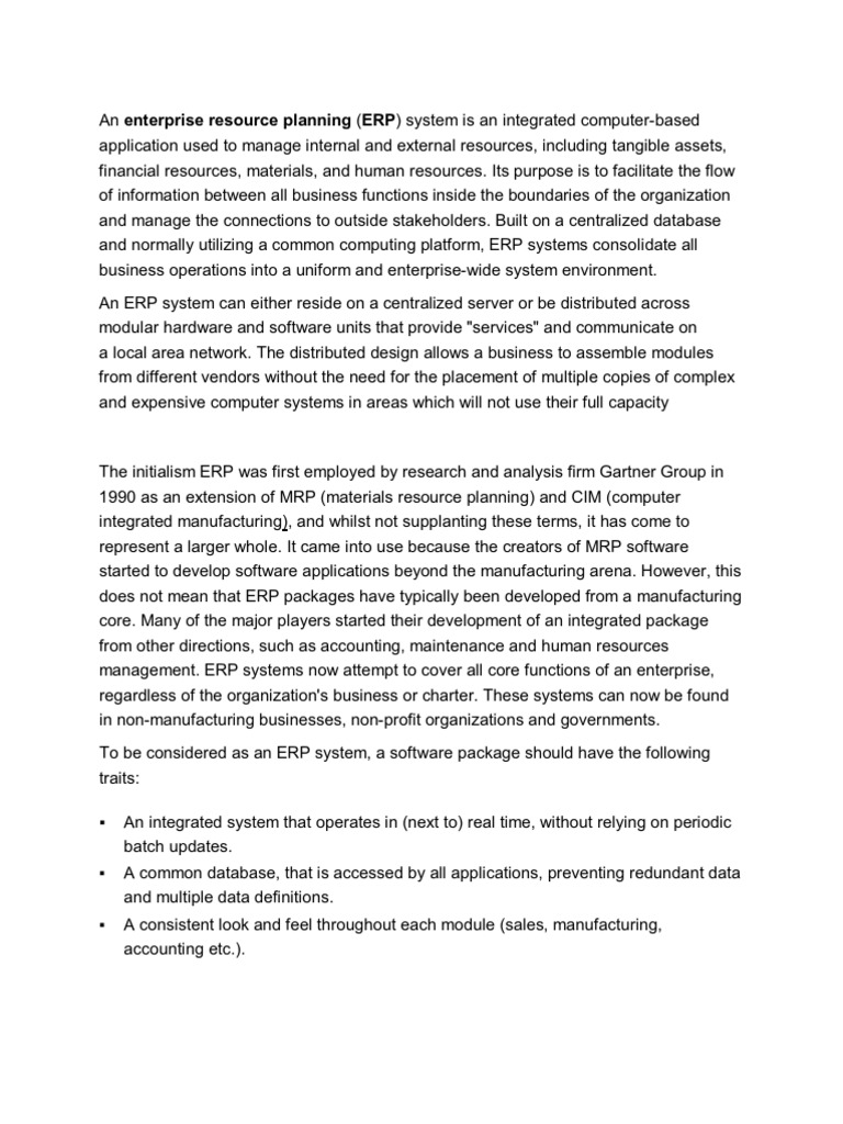 An enterprise resource planning (ERP) system is an integrated computer-based application used to manage internal and external resources, including