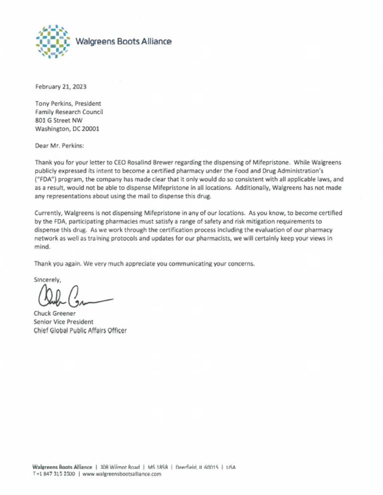 Walgreens responded to the group letter sent by Family Research Council, CatholicVote, and other pro-life organizations regarding mifepristone.