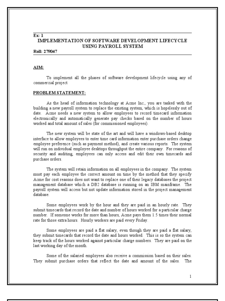 Roll: 279047 AIM: To implement all the phases of software development lifecycle using any of commercial project PROBLEM STATEMENT: As the head of information technology at Acme Inc., you are tasked with the building a new payroll system to replace the existing system, which is hopelessly out of date. Acme needs a new system to allow employees to record timecard information electronically and automatically generate pay checks based on the number of hours worked and total amount of sales (for commissioned employees). The new system will be state of the art and will have a windows-based desktop interface to allow employees to enter time card information enter purchase orders change employee preference (such as payment method), and create various reports. The system will run on individual employee desktops throughput the entire company. For reasons of security and auditing, employees can only access and edit their own timecards and purchase orders. The system will retain information on all employees in the company. The system must pay each employee the correct amount on time by the method that they specify Acme for cost reasons does not want to replace one of their legacy databases the project management database which a DB2 database is running on an IBM mainframe. The payroll system will access but not update information stored in the project management database. Some employees work by the hour and they are paid in an hourly rate. They submit timecards that record the date and number of hours worked for a particular charge number. If someone works for more than hours, Acme pays them 1.5 times their normal rate for those extra hours. Hourly workers are paid every Friday. Some employees are paid a flat salary, even though they are paid a flat salary, they submit timecards that record the date and hours worked. This is so the system can keep track of the hours worked against particular charge numbers. They are paid on the last working day of the month. Some of the salaried employees also receive a commission based on their sales. They submit purchase orders that reflect the date and amount of the sales. The 1