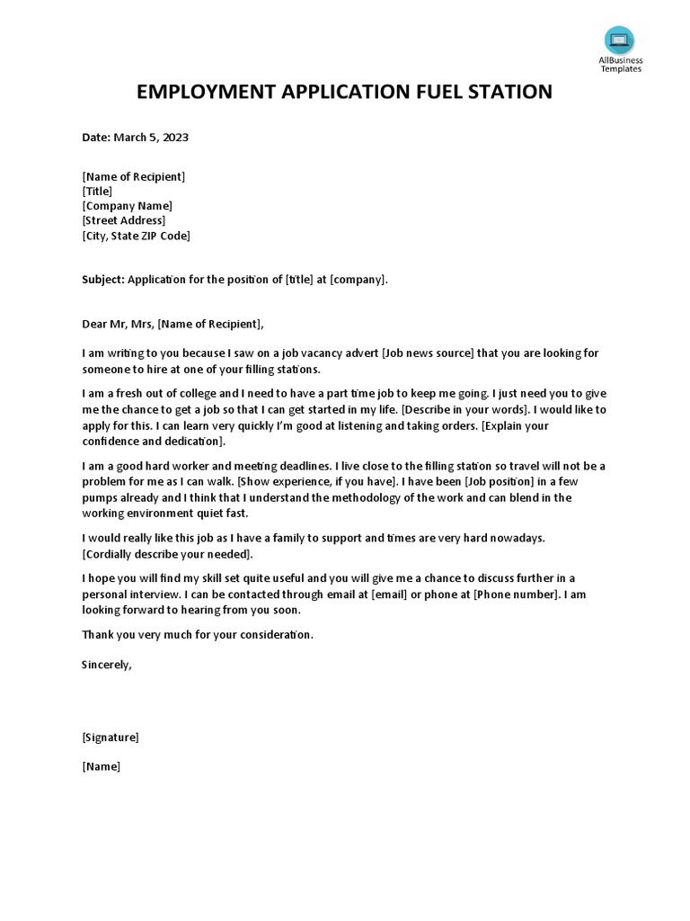 I am very interested in your posting for a [Position] advert for hiring at one of your filling stations,