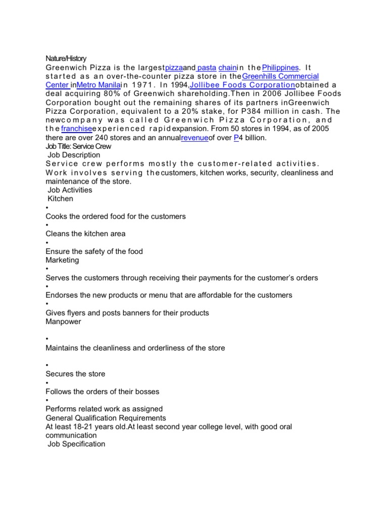 I t s t a r t e d a s a n over-the-counter pizza store in theGreenhills Commercial Center inMetro Manilai n 1 9 7 1 . I n 1994,Jollibee Foods Corporationobtained a deal acquiring 80% of Greenwich [Link] in 2006 Jollibee Foods Corporation bought out the remaining shares of its partners inGreenwich Pizza Corporation, equivalent to a 20% stake, for P384 million in cash. The newc o m p a n y w a s c a l l e d G r e e n w i c h P i z z a C o r p o r a t i o n , a n d t h e franchisee x p e r i e n c e d r a p i d expansion. From 50 stores in 1994, as of 2005 there are over 240 stores and an annualrevenueof over P4 billion. Job Title: Service Crew Job Description Ser vice cr ew per for ms mostl y the customer-related activities. W o r k i n v o l v e s s e r v i n g t h e customers, kitchen works, security, cleanliness and maintenance of the store. Job Activities Kitchen Cooks the ordered food for the customers Cleans the kitchen area Ensure the safety of the food Marketing Serves the customers through receiving their payments for the customers orders Endorses the new products or menu that are affordable for the customers Gives flyers and posts banners for their products Manpower Maintains the cleanliness and orderliness of the store Secures the store Follows the orders of their bosses Performs related work as assigned General Qualification Requirements At least 18-21 years [Link] least second year college level, with good oral communication Job Specification