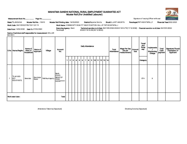 State:TELANGANA Muster Roll No. : 13610 Muster Roll Printing date : 14/02/2023 District:Rajanna Sirsilla Block:ELLANTHAKUNTA Panchayat:PATHIKUNTAPALLY Financial Year:2022-2023