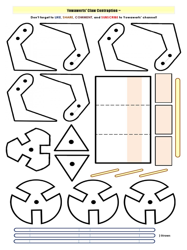 This document describes Yowawerts' Claw Contraption TM, which is a device made of straws that functions like a claw. The document encourages viewers to engage with Yowawerts' social media channel by liking, sharing, commenting, and subscribing.