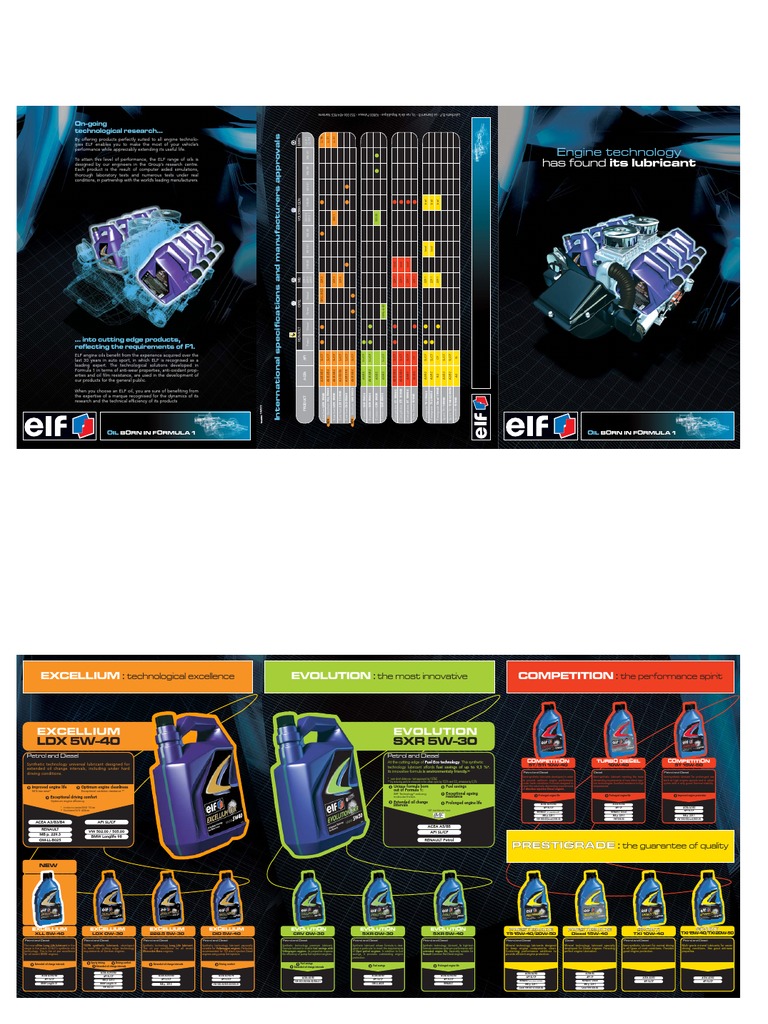 By offering products perfectly suited to all engine technologies ELF enables you to make the most of your vehicles performance while appreciably extending its useful life. To attain this level of performance, the ELF range of oils is designed by our engineers in the Groups research centre. Each product is the result of computer aided simulations, thorough laboratory tests and numerous tests under real conditions, in partnership with the worlds leading manufacturers.