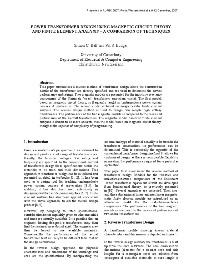 high-frequency effects, IEEE Trans. on Power Electronics, July 98, v. 13, No. 4, pp. 651-659. Petkov, R., Design issues of high-power highfrequency transformer, Proc. 1995 International Conference on Power Electronics and Drive Systems, Feb 95, v. 1, pp. 401-410. Asensi, R., Cobos, J.A., Garcia, O., Prieto, R., and Uceda, J., A full procedure to model high frequency transformer windings, IEEE Power Electronics Specialist Conference PESC94, June 94, v. 2, pp. 856-863. Allcock, R., McClelland, R., Holland, S.A., and Rou, A., Transformer design and analysis using finite element methods, IEE Colloquium on Computation in Electrostatics, 1995, pp. 8/1-8/3. Bodger, P.S., Liew, M.C., and Johnstone, P.T., A comparison of conventional and reverse transformer design, Australasian Universities Power Engineering Conference (AUPEC), Brisbane, Australia, September 2000, pp. 8085. Paul, C.R., Nasar, S.A., and Unnewehr, L.E., Introduction to Electrical Engineering, McGraw-Hill, Inc., Singapore, 1986. Say, M.G., Alternating Current Machines, Longman Scientific & Technical, England, 1983. Slemon, G.R., Magnetoelectric Devices: Transducers, Transformers, and Machines, John Wiley and Sons, Inc., USA, 1966. Connelly, F.C., Transformers: Their principles and design for light electrical engineers, Sir issac Putman & Sons Ltd, London, 1965. Infolytica, www.infolytica.com Ong, C. M., Dynamic Simulation of Electric Machinery using Matlab / Simulink, Prentice Hall, New Jersey, 1st edition. Lindbolm, A., Isberg, J. and Bernhoff, H., Calculating the coupling factor in a multilayer coaxial transformer with air core, IEEE Trans. On Magnetics, Nov 2004, v. 40, pp. 3244-3248. Edwards, J. D., An Introduction to MagNet for Static 2D Modelling, Infolytica Corporation. Margueron, X. and Keradec, J.-P., Design of equivalent circuits and characterization strategy of n-input coupled inductors, IEEE Transactions on Industry Applications, Jan Feb 07, v. 43, issue 1, pp. 14-22. Johnstone, P.T., and Bodger, P.S., High voltage disinfection of liquids, IPENZ Trans., Nov 97, v. 24, No. 1, EMCh, pp. 30-35. Mechler, G.F. and Girgis, R.S., Calculation of spatial loss distribution in stacked power and distribution transformer cores, IEEE Trans. on Power Delivery, Apr 98, v. 13, no. 2, pp. 532-537.