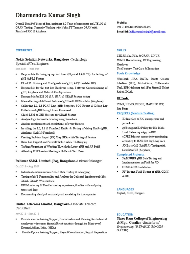 Overall Total 9.6 Years of Exp. including 6.0 Years of experience on LTE ,5G & Mobile: