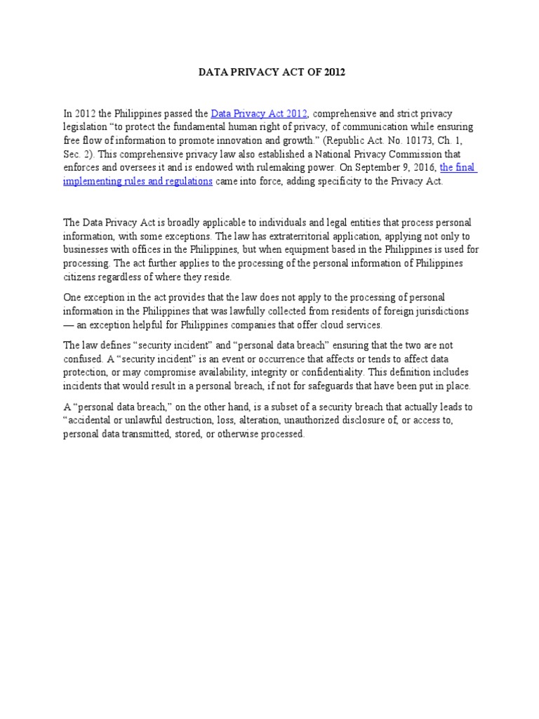 In 2012 the Philippines passed the Data Privacy Act 2012, comprehensive and strict privacy