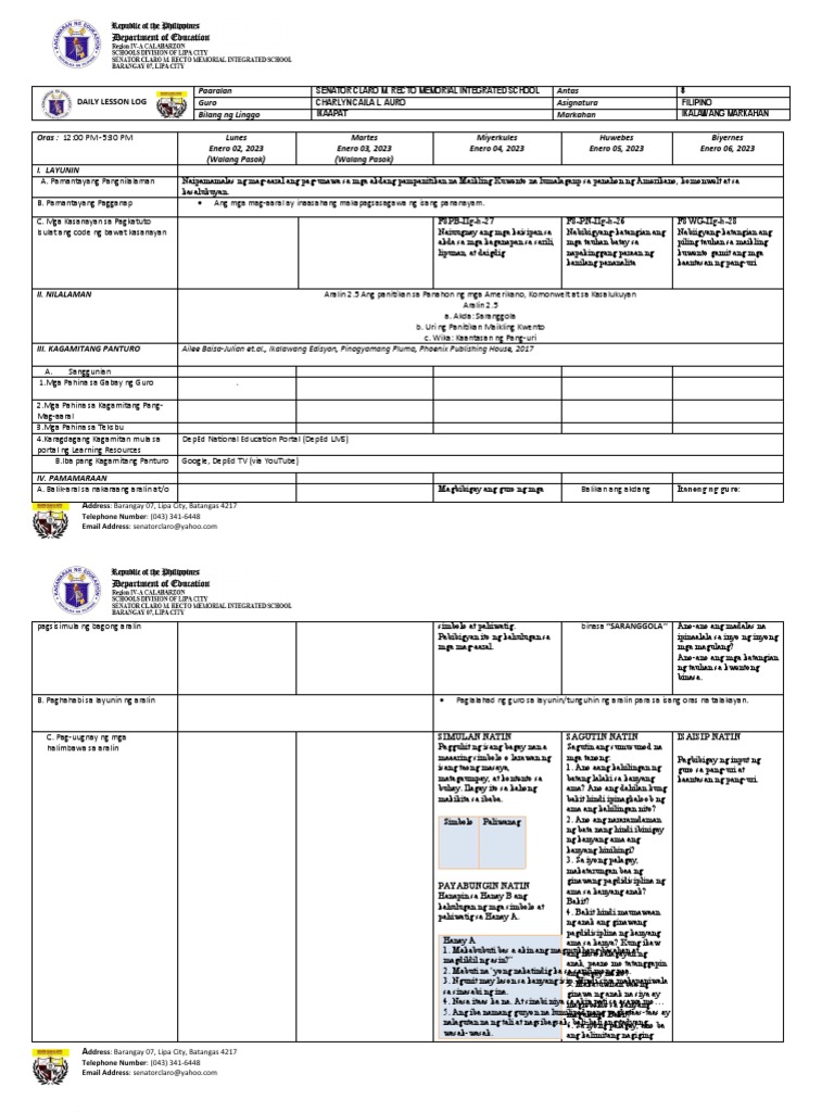 DAILY LESSON LOG Guro CHARLYN CAILA L. AURO Asignatura FILIPINO