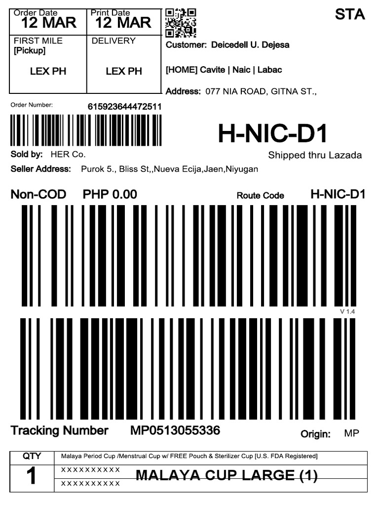 FIRST MILE DELIVERY Customer: Dhea Manzanero