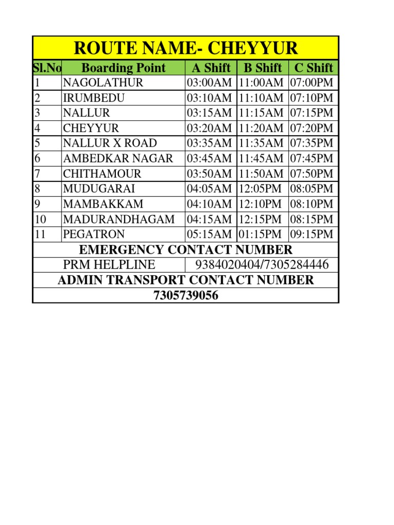 Sl.No Boarding Point A Shift B Shift C Shift