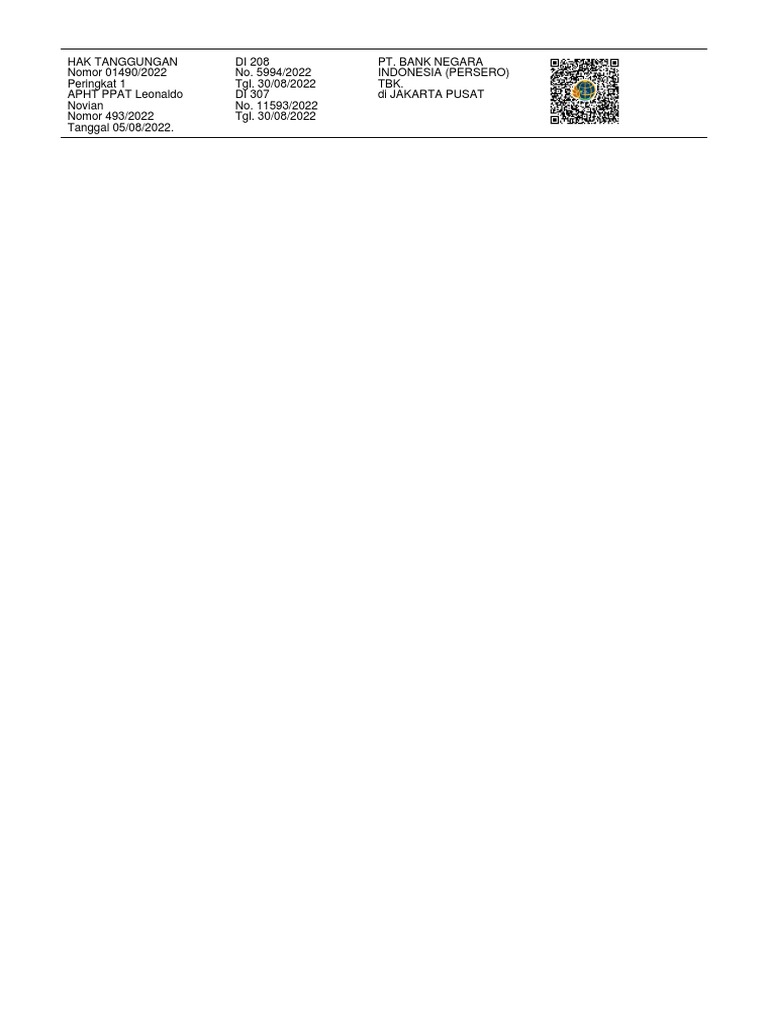 BANK NEGARA Nomor 01490/2022 No. 5994/2022 INDONESIA (PERSERO) Peringkat 1 Tgl. 30/08/2022 TBK. APHT PPAT Leonaldo DI 307 di JAKARTA PUSAT Novian No. 11593/2022 Nomor 493/2022 Tgl. 30/08/2022 Tanggal 05/08/2022.