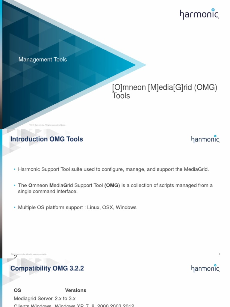 • The Omneon MediaGrid Support Tool (OMG) is a collection of scripts managed from a