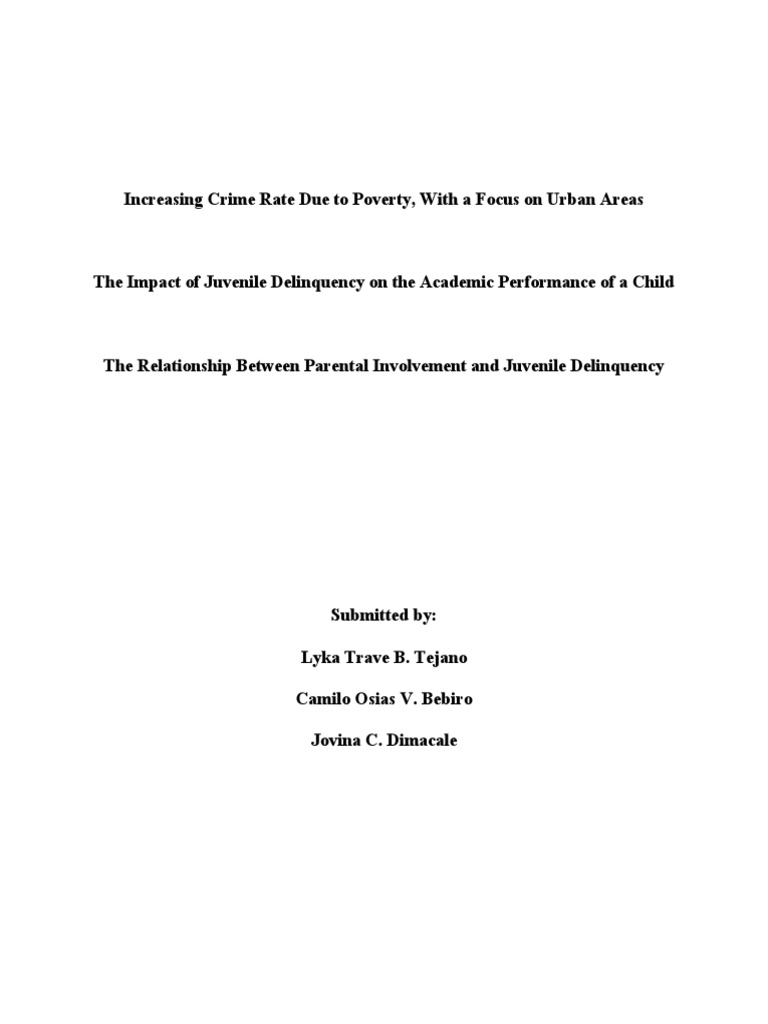 This paper examines the relationship between juvenile delinquency, poverty, parental involvement, and academic performance. It explores how poverty and lack of parental involvement can contribute to higher rates of juvenile crime, especially in urban areas, and how delinquency can negatively impact a child's academic performance. The paper was submitted by Lyka Trave B. Tejano, Camilo Osias V. Bebiro, and Jovina C. Dimacale.
