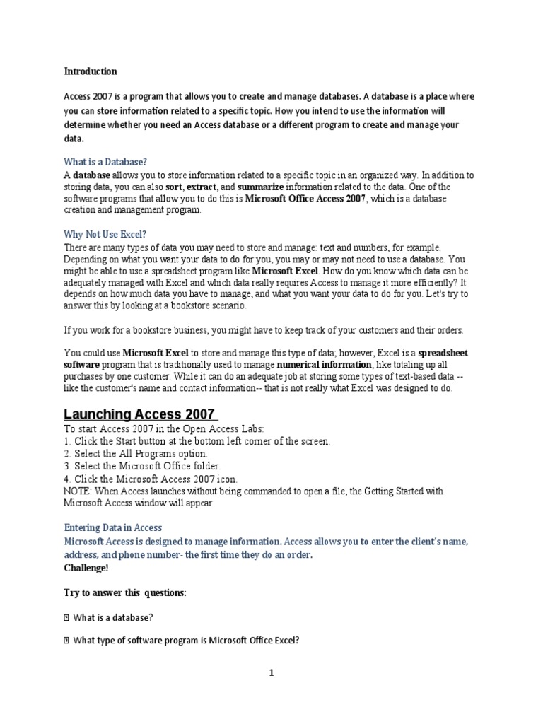 Access 2007 is a program that allows you to create and manage databases. A database is a place where