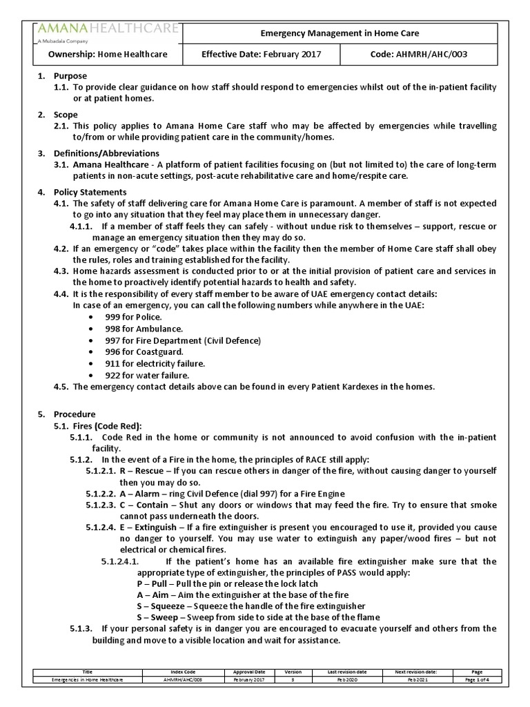 Emergencies in Home Healthcare AHMRH/AHC/003 February 2017 3 Feb 2020 Feb 2021 Page 1 of 4