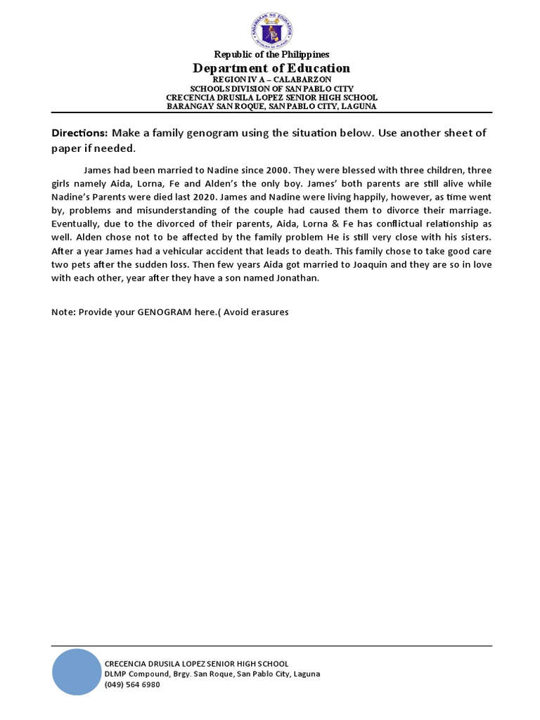Directions: Make a family genogram using the situation below. Use another sheet of