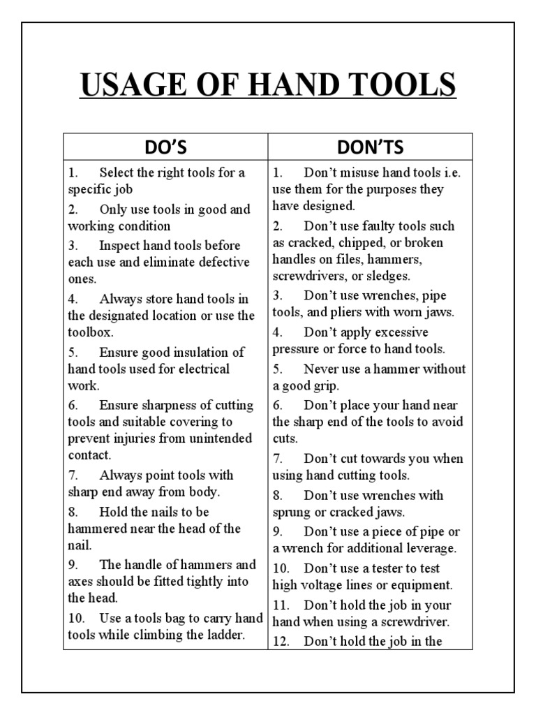 1. Select the right tools for a 1. Don’t misuse hand tools i.e.