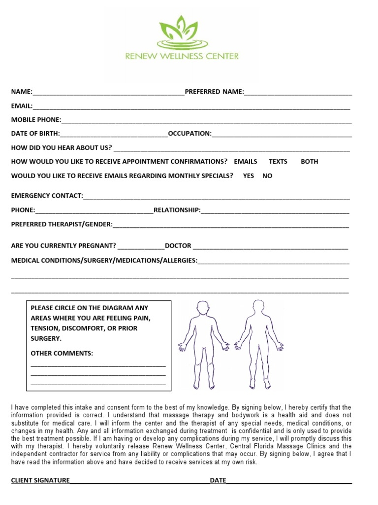 with my therapist. I hereby voluntarily release Renew Wellness Center, Central Florida Massage Clinics and the