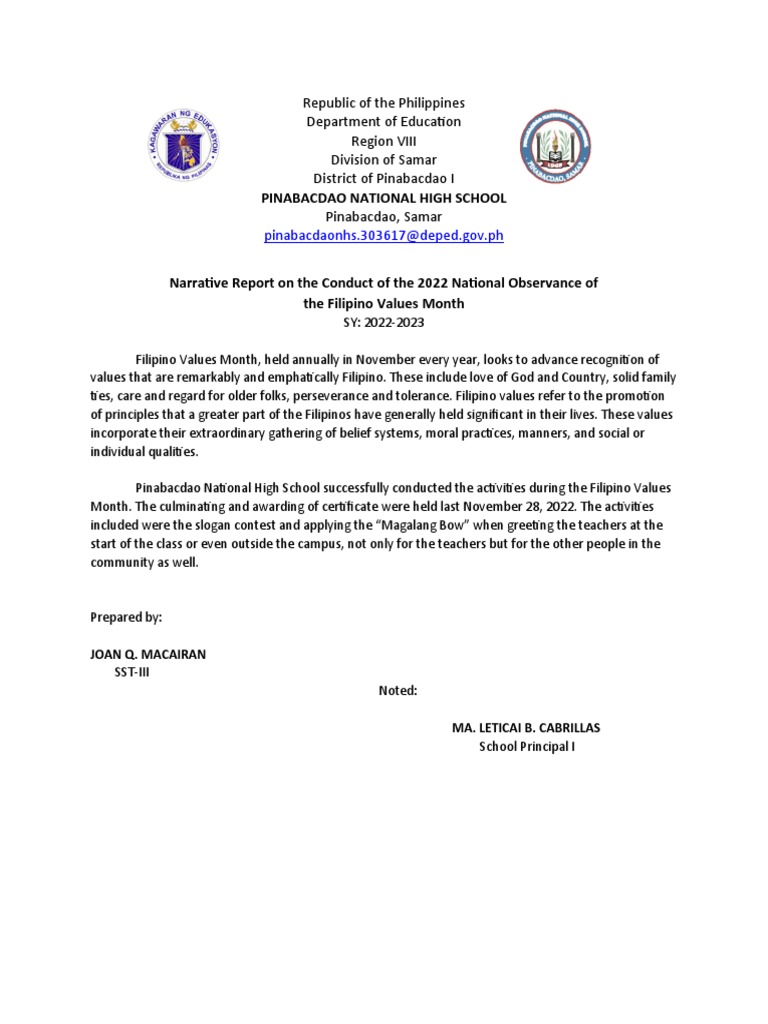 Pinabacdao National High School successfully conducted the activities during the Filipino Values