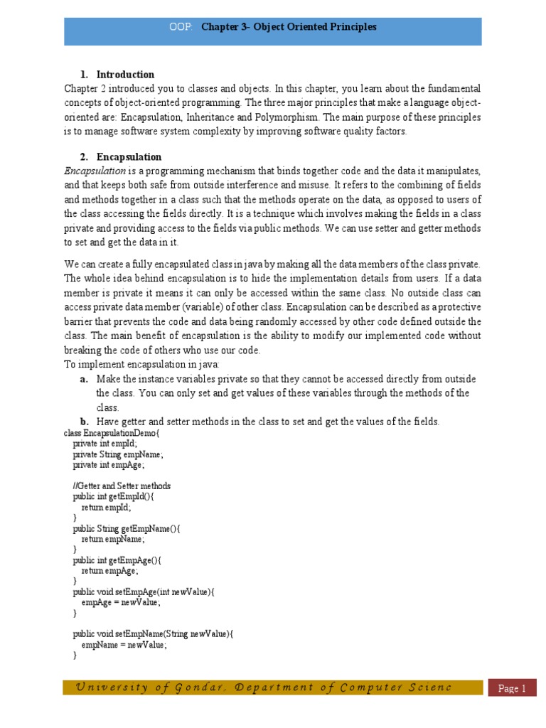 oriented are: Encapsulation, Inheritance and Polymorphism. The main purpose of these principles