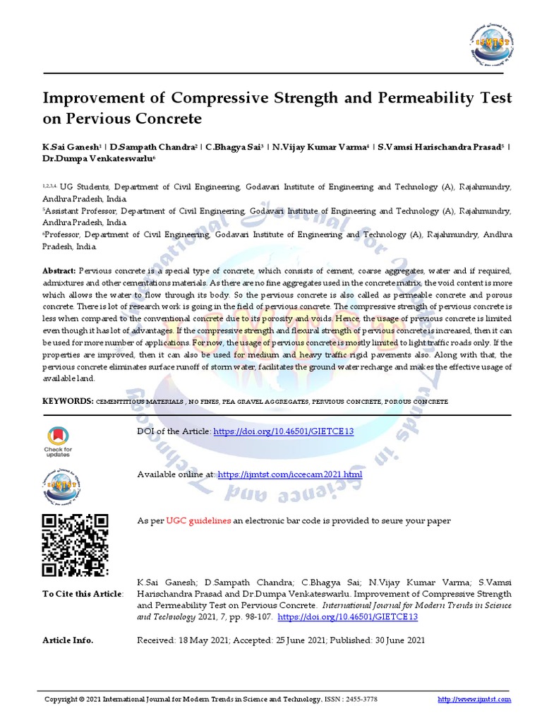 Abstract: Pervious concrete is a special type of concrete, which consists of cement, coarse aggregates, water and if required,