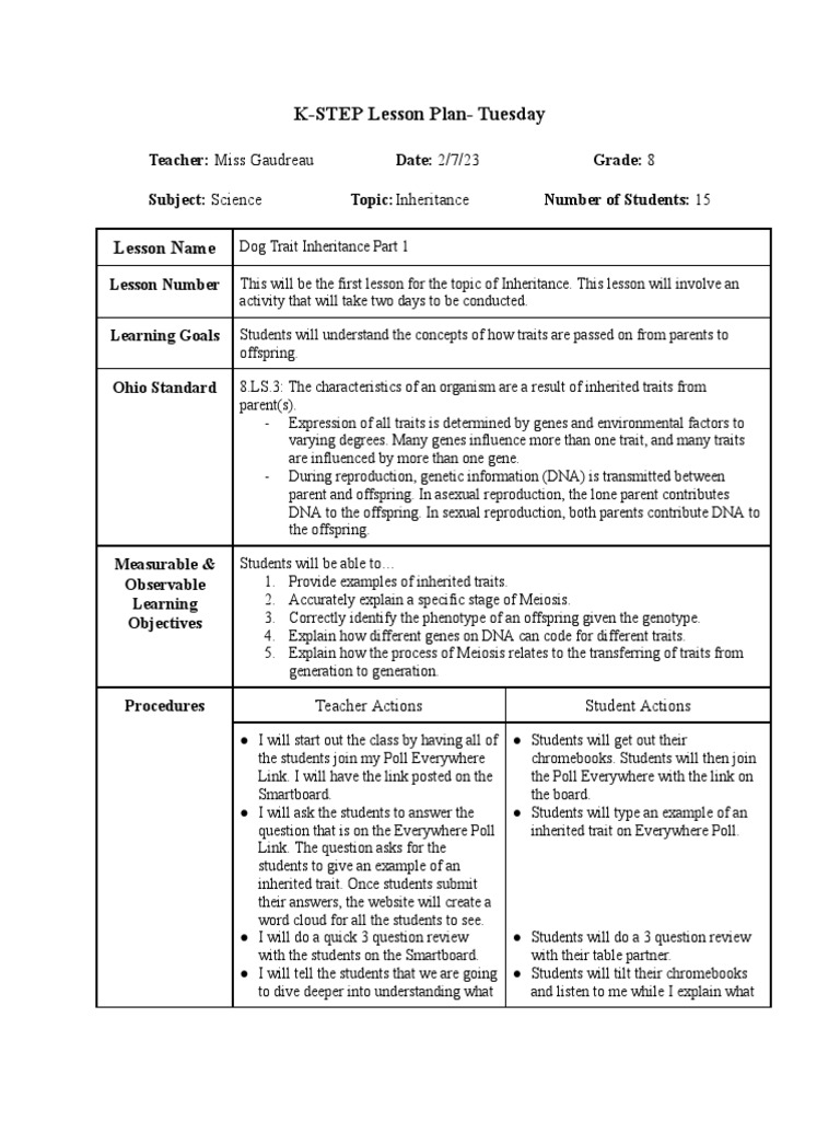 Ohio Standards 8.LS.3: The characteristics of an organism are a result of inherited traits from