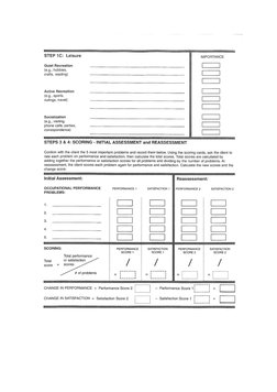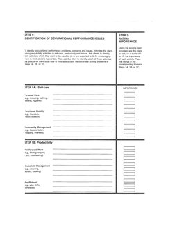 - Assessment Steps: Outlines steps for identifying occupational performance issues and rating their importance.