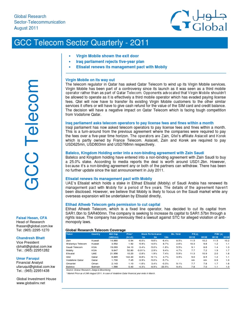 Virgin Mobile on its way out The telecom regulator in Qatar has asked Qatar Telecom to wind up its Virgin Mobile services. Virgin Mobile has been part of a controversy since its launch as it was seen as a third mobile operator rather than as part of Qatar Telecom. Opponents advocated that Virgin Mobile shouldnt be allowed to operate as it is effectively a third mobile operator which has evaded paying license fees. Qtel will now have to transfer its existing Virgin Mobile customers to the other similar services it offers or will have to give cash refund for the value of the SIM card and credit balance. The decision will have a negative impact on Qatar Telecom which is facing tough competition from Vodafone Qatar. Iraq parliament asks telecom operators to pay license fees and fines within a month Iraqi parliament has now asked telecom operators to pay license fees and fines within a month. This is a turn-around from the previous agreement where the companies were required to pay the fees over a five-year time horizon. The operators are Zain, Qtels affiliate Asiacell and Korek which is partly owned by France Telecom. Asiacell, Zain and Korek are required to pay USD625mn, USD803mn and USD768mn respectively. Batelco, Kingdom Holding enter into a non-binding agreement with Zain Saudi Batelco and Kingdom holding have entered into a non-binding agreement with Zain Saudi to buy a 25.0% stake. According to media reports the deal is worth around USD1.2bn. However, because its a non-binding agreement any or both of the partners can withdraw. There has been no further update since the last announcement in July 2011. Etisalat renews its management pact with Mobily UAEs Etisalat which holds a stake in Etihad Etisalat (Mobily) of Saudi Arabia has renewed its management pact with Mobily for a period of five years. The details of the agreement havent been disclosed. However, we believe that Mobily is likely to focus on the Saudi market while any overseas expansion will be undertaken by Etisalat directly, Etihad Atheeb Telecom gets permission to cut capital Etihad Atheeb Telecom, which is a fixed line operator, has decided to cut its capital from SAR1.0bn to SAR400mn. The company is seeking to increase its capital to SAR1.57bn through a rights issue. The company has previously filed a lawsuit against STC for alleged violation of antimonopoly laws.