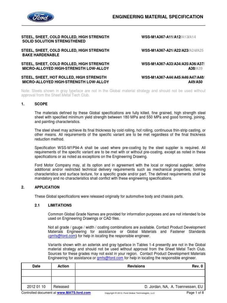 STEEL, SHEET, COLD ROLLED, HIGH STRENGTH WSS-M1A367-A11/A12/A13/A14