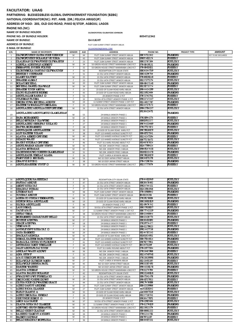 S/N. NAME OF RECIPIENTS GENDER AGE ADDRESS PHONE NO. PROJECT TYPE AMOUNT