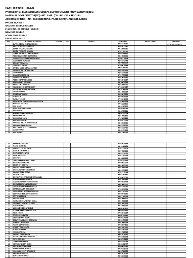 S/N. NAME OF RECIPIENTS GENDER AGE ADDRESS PHONE NO. PROJECT TYPE AMOUNT