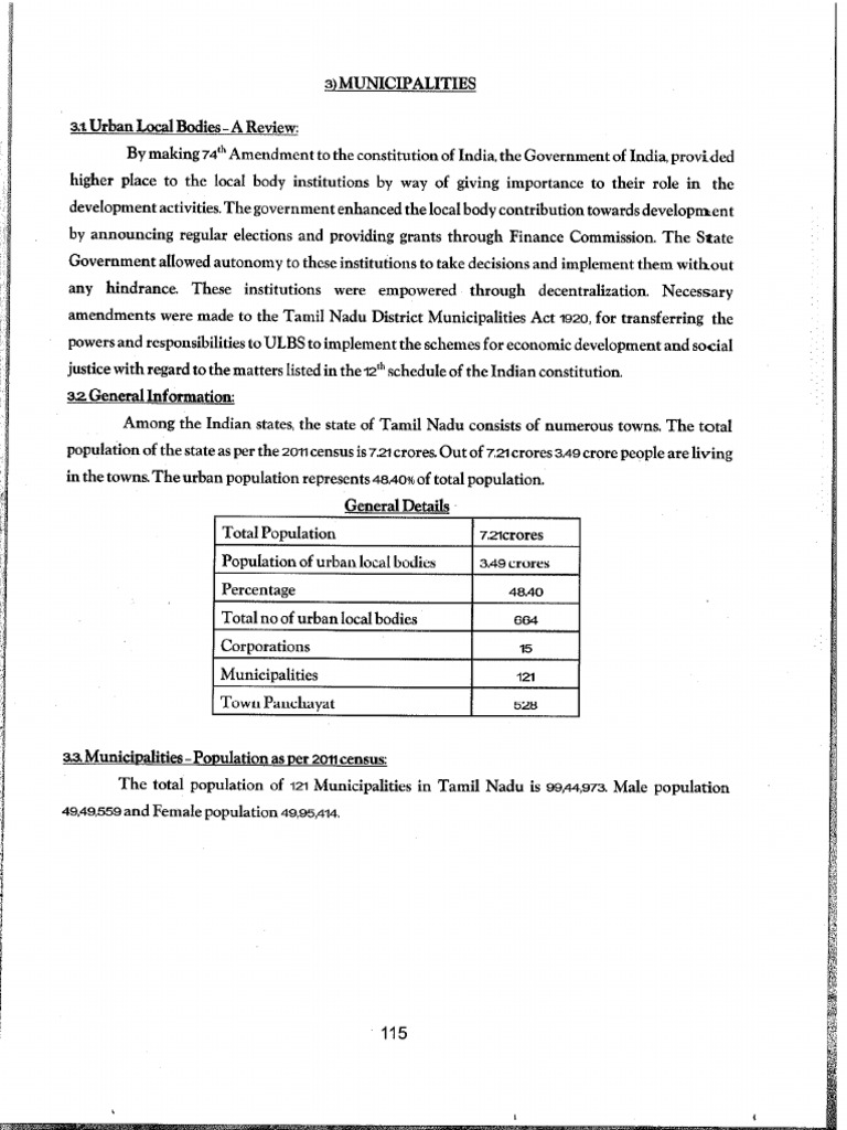 three tier Rural Local Bodies, Municipalities and Town Panchayats.