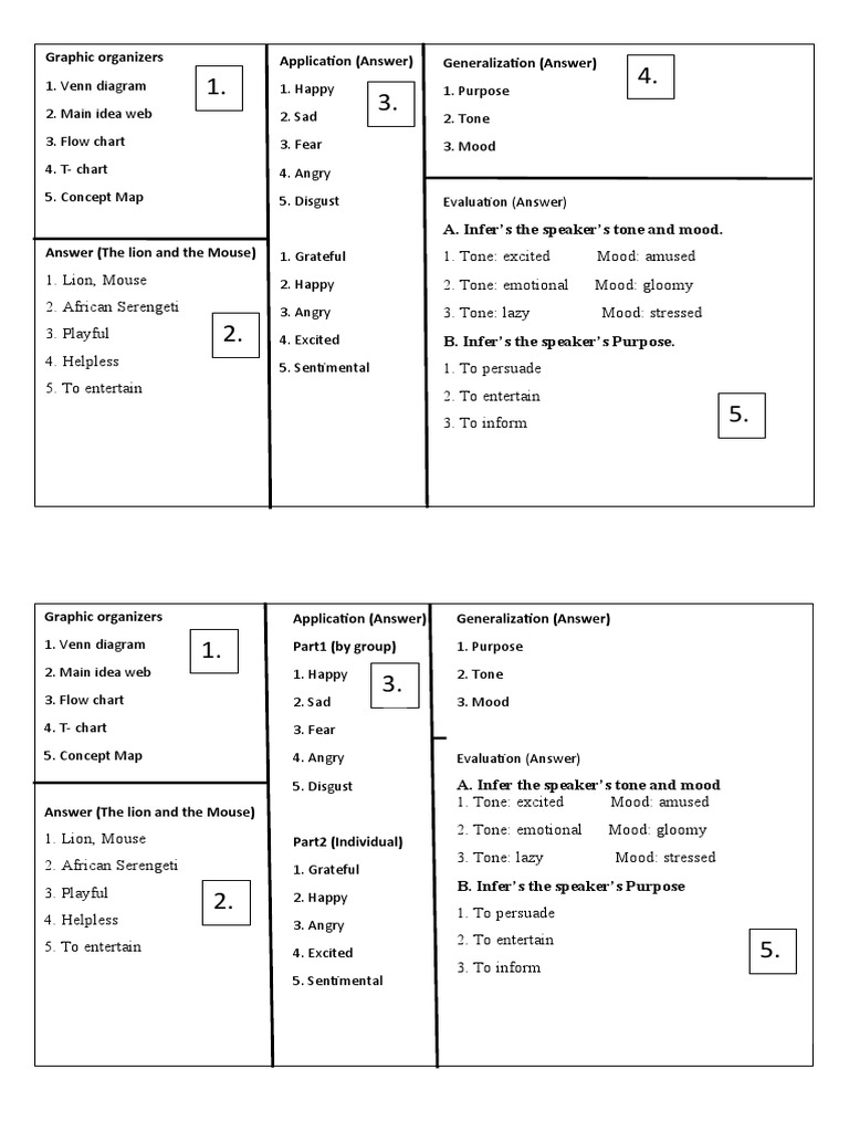 1. Lion, Mouse 2. Happy 2. Tone: emotional Mood: gloomy