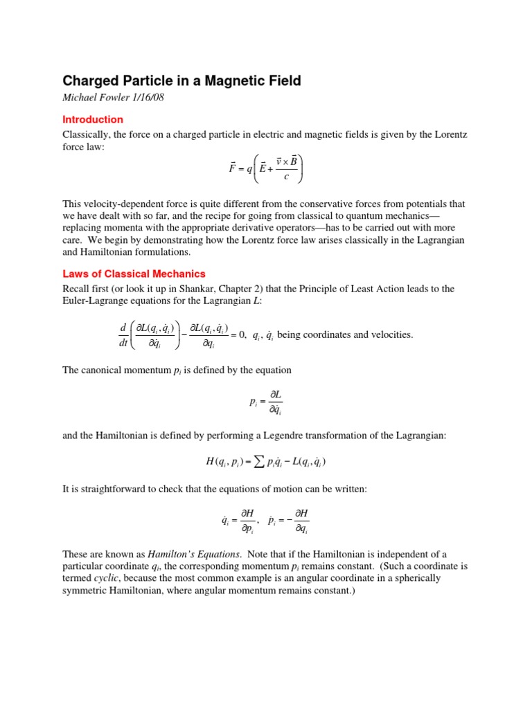 Michael Fowler 1/16/08 Introduction Classically, the force on a charged particle in electric and magnetic fields is given by the Lorentz force law: vB F = q E + c This velocity-dependent force is quite different from the conservative forces from potentials that we have dealt with so far, and the recipe for going from classical to quantum mechanics replacing momenta with the appropriate derivative operatorshas to be carried out with more care. We begin by demonstrating how the Lorentz force law arises classically in the Lagrangian and Hamiltonian formulations. Laws of Classical Mechanics Recall first (or look it up in Shankar, Chapter 2) that the Principle of Least Action leads to the Euler-Lagrange equations for the Lagrangian L: