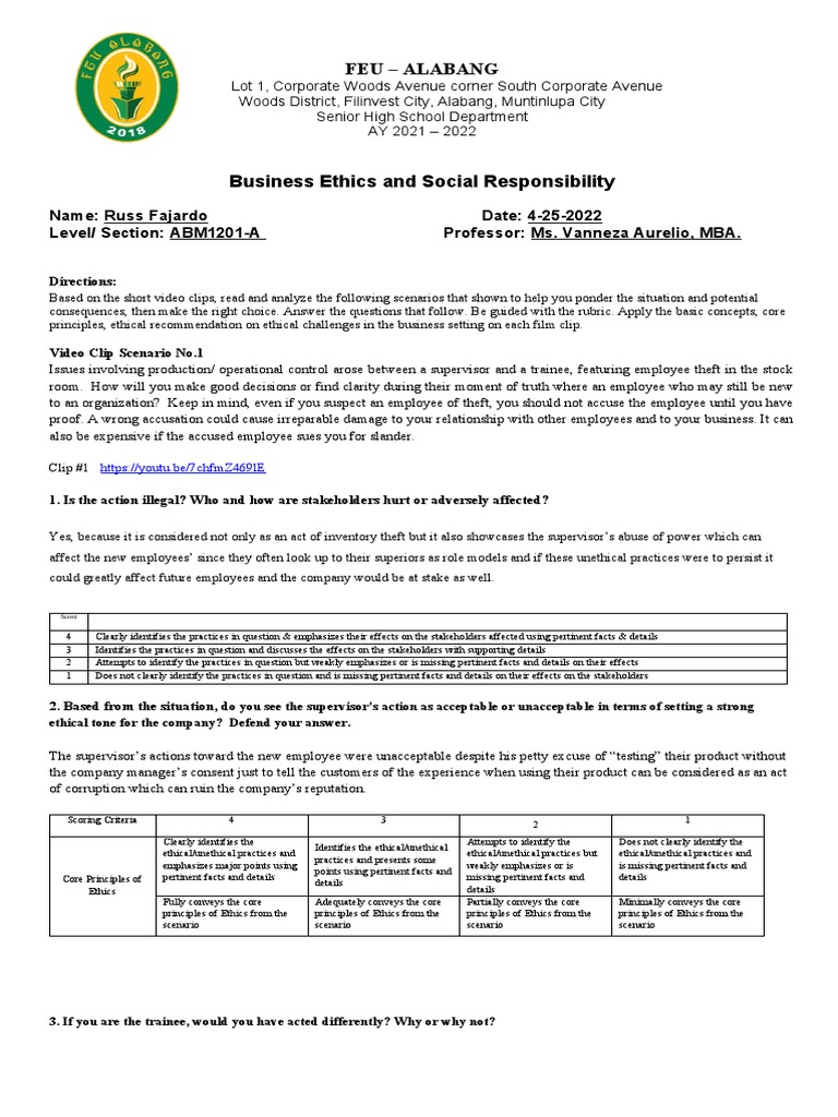 consequences, then make the right choice. Answer the questions that follow. Be guided with the rubric. Apply the basic concepts, core