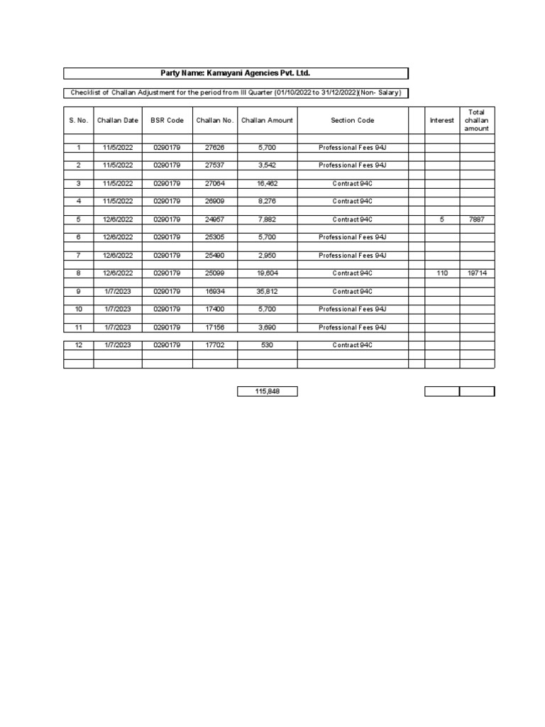 S. No. Challan Date BSR Code Challan No. Challan Amount Section Code Interest challan