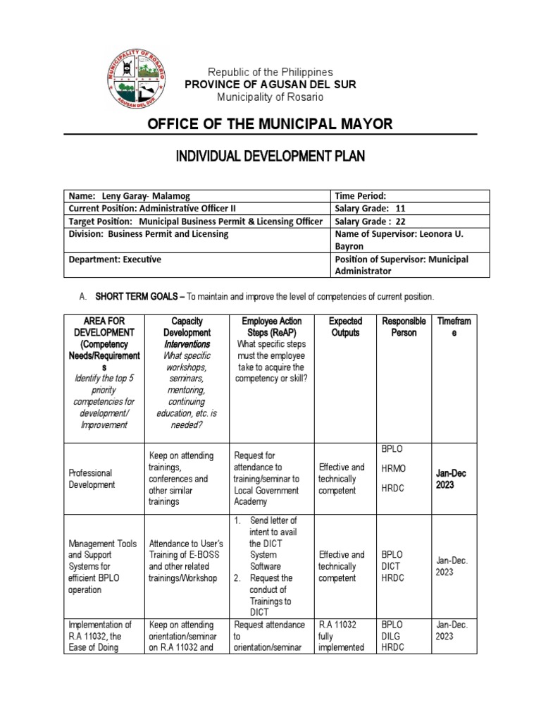 that this agreed Individual Development Plan of my staff is achieved LEONORA U, BAYRON