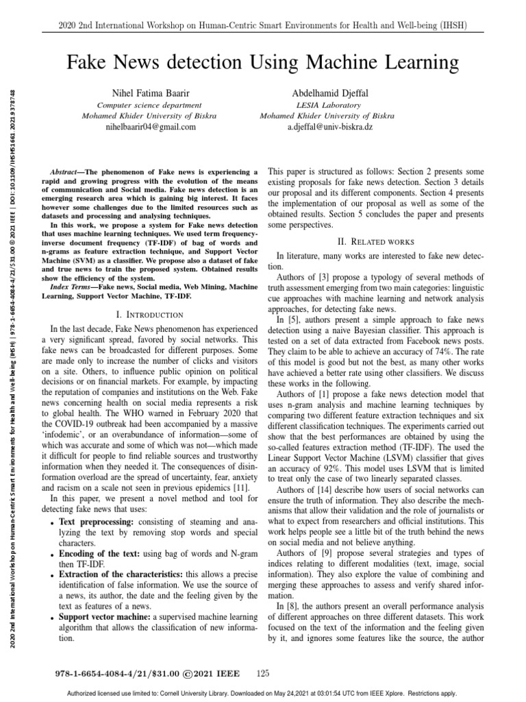 Fake News Detection Using Machine Learning: Nihel Fatima Baarir Abdelhamid Djeffal
