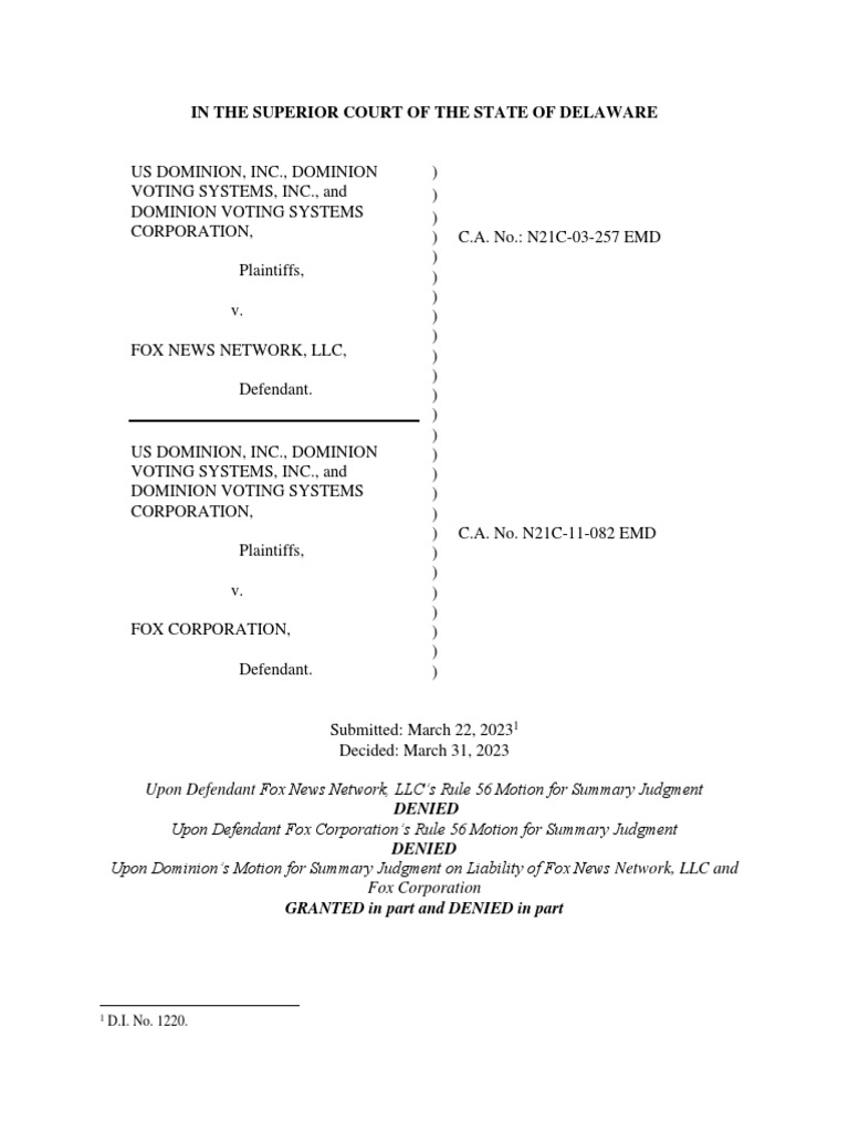 US DOMINION, INC., DOMINION VOTING SYSTEMS, INC., and DOMINION VOTING SYSTEMS CORPORATION, Plaintiffs, v. FOX NEWS NETWORK, LLC, Defendant. US DOMINION, INC., DOMINION VOTING SYSTEMS, INC., and DOMINION VOTING SYSTEMS CORPORATION, Plaintiffs, v. FOX CORPORATION, Defendant. ) ) ) ) C.A. No.: N21C-03-257 EMD ) ) ) ) ) ) ) ) ) ) ) ) ) ) ) C.A. No. N21C-11-082 EMD ) ) ) ) ) ) ) Submitted: March 22, 2023