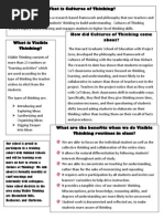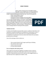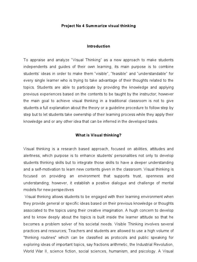 Introduction To appraise and analyze Visual Thinking as a new approach to make students independents and guides of their own learning, its main purpose is to combine students ideas in order to make them visible, feasible and understandable for every single learner who is trying to take advantage of their thoughts related to the topics. Students are able to participate by providing the knowledge and applying previous experiences based on the contents to be taught by the instructor; however the main goal to achieve visual thinking in a traditional classroom is not to give students a full explanation about the theory or a guideline procedure to follow step by step but to let students take ownership of their learning process while they apply their knowledge and or any other idea that can be inferred in the developed tasks. What is Visual thinking? Visual thinking is a research based approach, focused on abilities, attitudes and alertness, which purpose is to enhance students personalities not only to develop students thinking skills but to integrate those skills to have a deeper understanding and a self-motivation to learn new contents given in the classroom. Visual thinking is focused on providing an environment that supports trust, openness and understanding; however, it establish a positive dialogue and challenge of mental models for new perspectives Visual thinking allows students to be engaged with their learning environment when they provide general or specific ideas based on their previous knowledge or thoughts associated to the topics using their creative imagination. A hugh concern to develop and to know deeply about the topics is built inside the learner attitude so that he becomes a problem solver of his societal needs. Visible Thinking involves several practices and resources; Teachers and students are allowed to use a high volume of "thinking routines" which can be classified as protocols and public speaking for exploring ideas of important topics, say fractions arithmetic, the Industrial Revolution, World War II, science fiction, social sciences, humanism, and psicology. A Visual