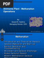 [Link]: In the methanation step final traces of carbon oxides present in the process gas leaving the absorber is converted into CH4 by reacting with H2 present in process gas in presence of a nickel catalyst at a temperature of around [Link] oxides of carbon are poisons for the ammonia synthesis catalyst and are therefore required to be [Link] the exit of methanator a pure synthesis of H2:N2 mole ratio of 3:1 is obtained with less than 1%CH4, which is eventually purged from the synthesis loop. Catalyst: - Nickel Temperature: - 300 C Reaction: - CO + 3H2 = CH4 + H2O + heat CO2 + 4H2 = CH4 + 2H2O + heat Effluent: - H2, N2, CH4, A, CO+CO2 (in traces) The hot methanator outlet gas is cooled in two steps in Methanator BFW Heater,where it is cooled to 134C and then by cooling water in Methanator Effulent Cooler to [Link] gas then flows to synthesis gas compressor suction [Link] condensate collected in compressor suction drum and the purified synthesis gas leaving the drum is sent to synthesis gas compressor.