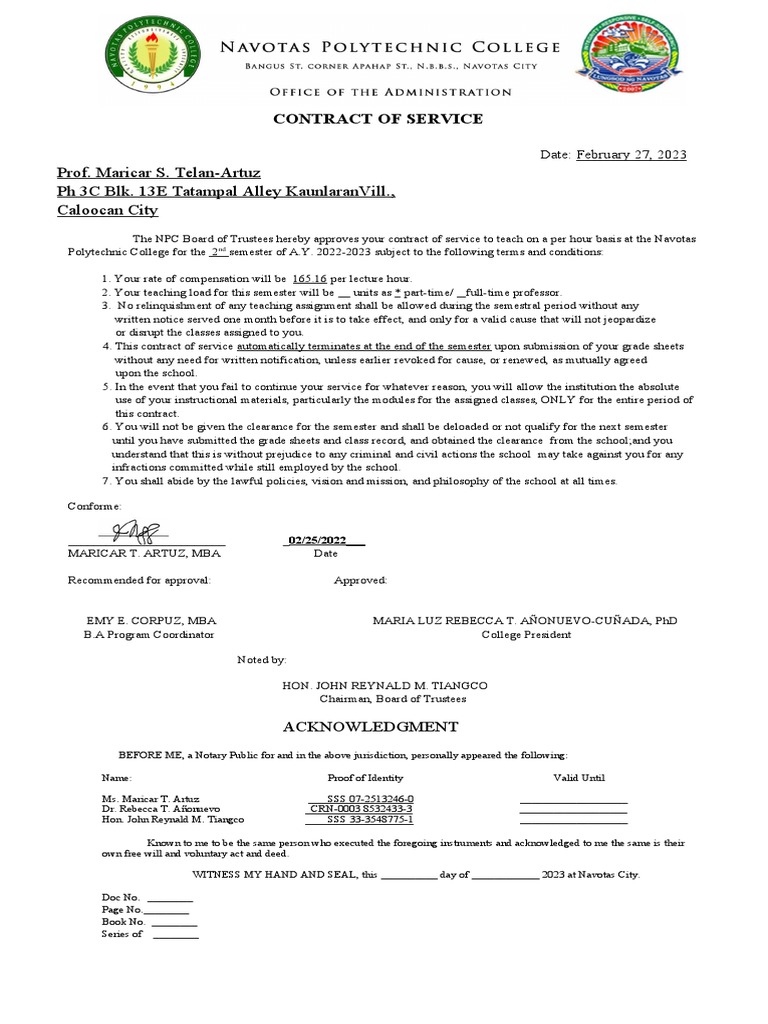 The NPC Board of Trustees hereby approves your contract of service to teach on a per hour basis at the Navotas