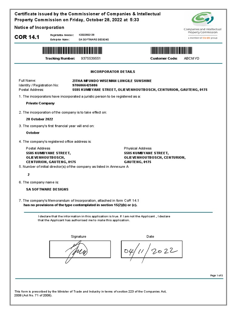 7. The company's Memorandum of Incorporation, attached in form CoR 14.1